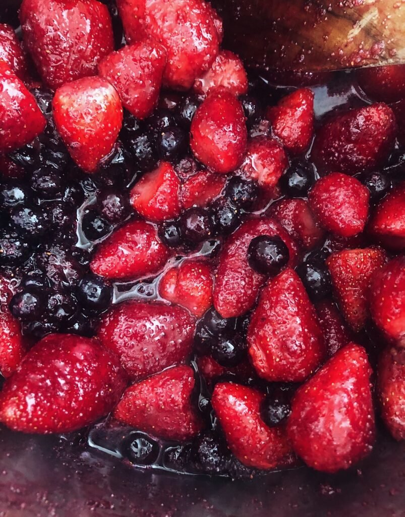 Lige denne ratio af blåbær og jordbær sammen, er noget begge vores børn holder af, den er let at lave og har et frugtindhold på over 80%, hvilket jeg har valgt til denne marmelade for at opretholde den rette ph værdi for langtidsholdbarhed.