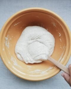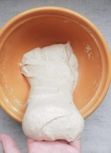 - Gentag indtil du har trukket og foldet og roteret skålen 4 gange i alt og lad så dejen hvile i 15 minutter ved ca. 24-25 grader overdækket.