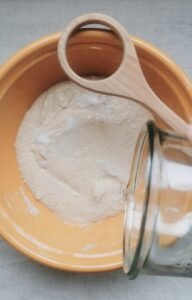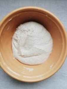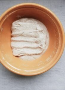 - Tag din aktiverede surdej og bland den med vand og mel. rør det til en relativ tør og fast levain og lad den stå i et rum der er ca. 24-25 grader i ca. 3 time,