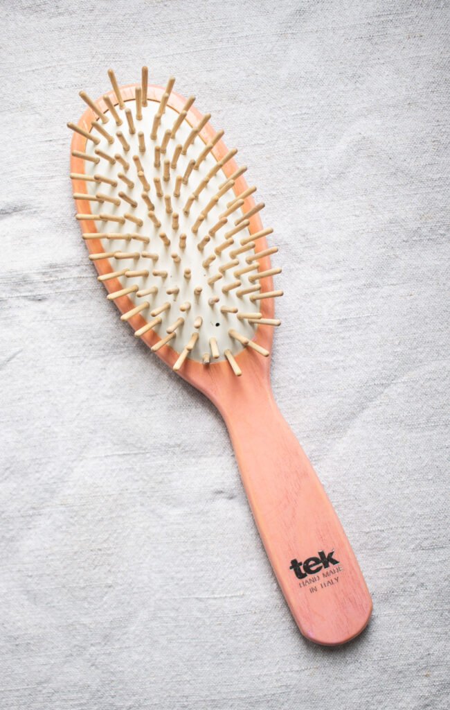 Den anden er denne børste, som jeg købte i Vilnius for 2 år siden også fra italienske TEK. Det eneste jeg kan sige er, at vildsvinebørster holder uendeligt lang tid, hvis du passer på dem. De er effektive til at udrede fint og tyndt hår, de er gode til at balancere tørt hår, de er fantastiske til glatredning og perfekte til finish og shine. Vores datter elsker at få børstet hår med den her. Det er en børste jeg ikke ville være foruden. Det eneste issue, som jeg altid har med de her børster er, at der samler sig fnuller i bunden over tid, som man også kan se, det er svært at fjerne, men holder du den ren bliver det aldrig værre end du kan se på billedet.