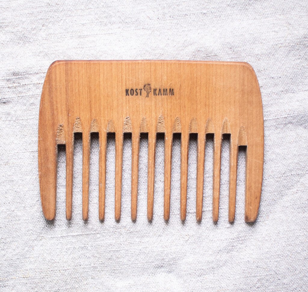 Jeg bruger denne trækam fra Kostkamm, den er super god. Det er en 10 cm styling kam i teak træ og det er min yndlings trækam, jeg har haft i den i 6 år og den holder så godt, ingen tænder er knækket.