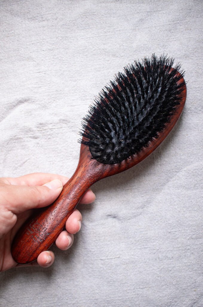 I den periode stoppede jeg også med at bruge plastik børster og kamme. Det er ca. 12 år siden nu. En af de ting som jeg først opdagede, efter jeg gik over til at børste mit hår naturligt (uden plast/silicone m.m.) var, at mit hår blev mindre skidt og fnug holdigt. Det stoppede også med at være statisk og ja det blev mere harmonisk i sin fedt balance, netop fordi at naturlige redskaber til hårbørstning hjælper til at distribuere skalpens sebum/olie ned igennem hårets længde til spidserne.