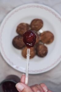 - Når æbleskiverne har fået lidt farve i kanten, kan du bruge din strikkepind til at vende dem en halv omgang. Det er også her jeg gerne tilsætter fyld normalt, foreksempel chokoladestykker og lidt ekstra dej i hvert rum.