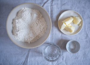• Når mel og fedt er smuldret fint som på billedet ovenfor, blandes salt og vand i dejen.