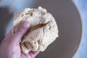 • Når du har æltet et par minutter ser dejen sådan her ud. Den giver slip uden at klistre.