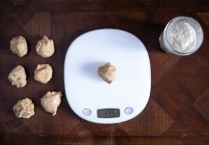 • Så vejer jeg kugler af ca. 40-41g per styk af. (bager man med smør og formalet enkorn er det en god idé at køle dejkuglerne ned i køleskabet imens man ruller brødene ud, da dejen ellers kan blive mere besværgelig at arbejde med, fordi den bliver meget blød)