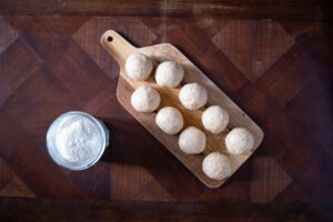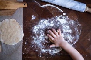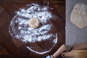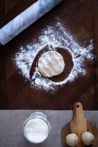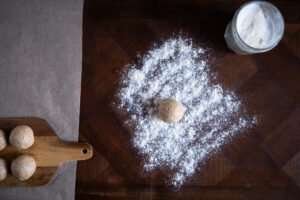 • Gør bordet klar med lidt mel og lægger den første melbolle klar.