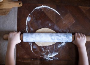 • Rul den ud så den er på størrelse med en kagetallerken, det plejer at kunne gøres ved 2-4 tag, med en marmor kagerulle går det meget hurtigt.