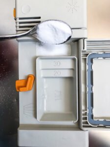 - Fyld det lille rum ved siden af sæberummet med 2 spsk citronsyre ved hver vask. Her kan du også putte din enzym rengøring i. Har du ikke dette rum (det har vi foreksempel ikke i vores lille hus), så kan du blot putte begge dele i bunden af opvaskemaskinen, jeg lægger det ude i venstre side, så det når at blive opløst inden det kommer i direkte kontakt med opvaskepulveret.