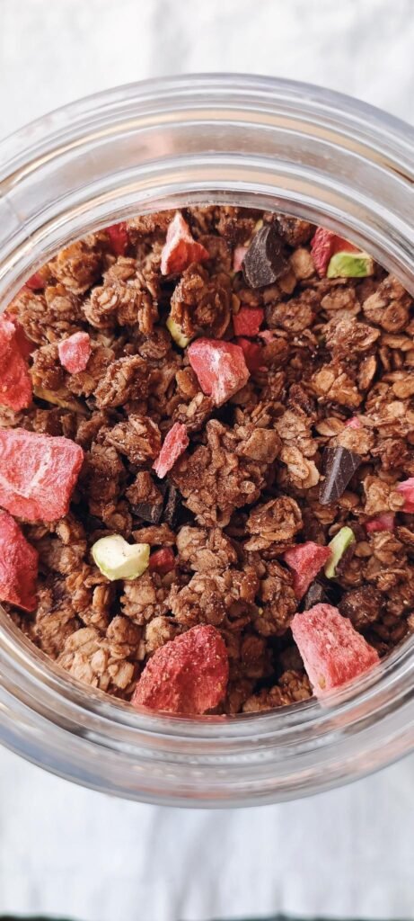 Saltet Chokolade Granola med Jordbær & Pistacie