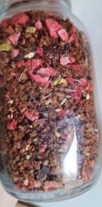 Så let var det, at lave en granola der giver kakaomælk uden tilsætningsstoffer, olie og raffineret sukker. Man kan lave granolaen uden det ekstra fyld, hvis man bare vil have ren chokolade, eller ikke lige har adgang til bær eller lyst til nødder. Jeg håber du får lyst til at prøve og husk at jeg bliver så glad, hvis du skriver en kommentar nedenfor, eller deler hvordan det gik, inde i signalgruppen. Hav det skønt!