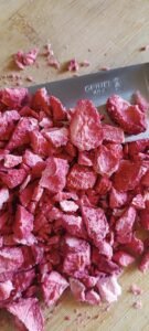 Det gider vi ikke, så lav det selv istedet. Denne granola indeholder også mest honning og kun 1 spsk hjemmelavet vanillesukker. Jeg har tilsat frysetørrede jordbær, som er super delikate i granola, de giver både syre og sødme. Man kan få nogle som er ekstremt lækre, jeg plejede at købe dem hos biogan, da vi havde butikken. Dem lavede jeg en Gasteiner Granola med, som er en virkelig skøn granola uden frø og fyldt med bær, den deler jeg nok en anden god gang.