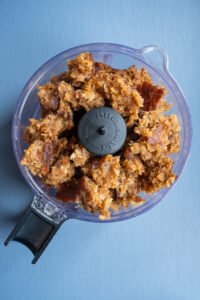 - Put dadlerne i food processoren og pulse indtil de ser således ud.