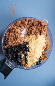- Tilføj nu blåbær, kakaopulver, vanilje, salt og ernæringsgær og pulse indtil det er kombineret uden at myrde blåbærene helt.