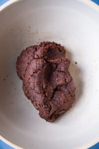 - Massen ser således ud når den er klar til æltning og herefter puttes den i en røreskål.