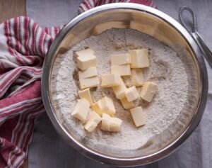 - Smørternene smuldres ind i melet (afkøl dine hænder inden du gør dette, ved at vaske dem i koldt vand, så opvarmes dejen ikke ligeså hurtigt)