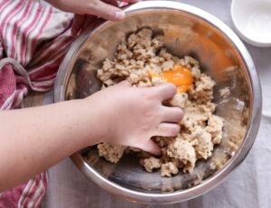 - Når alt smørret er smuldret, så det ligner brødkrummer, tilsættes æggeblommen.