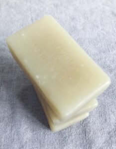 Jeg bruger som altid en Savon de Marseille, som er baseret på oksetælle og kokos i denne opskrift, da jeg finder den renser bedst. Jeg sælger også disse barer, som jeg ikke selv producerer, men som jeg selv bruger til diverse ting i min husholdning.