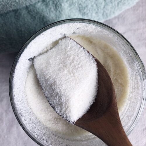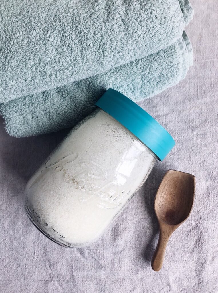 Vaskepulver er slet ikke besværgeligt, faktisk meget lettere at dosere og ofte mere drøjt end flydende sæbe. Som jeg jo også har en opskrift på og ofte laver jeg begge dele. Når det så er sagt så synes jeg virkeligt at det her super enkle vaskepulver vasker renere, end min flydende sæbe. Derudover kan det opbevares forevigt, det bliver aldrig muggent og ja man kan have det i et dejligt smukt glas med en pæn ske og ja den slags finder jeg godt hvis man ønsker at velsigne sit hjem med en vis æstetik.